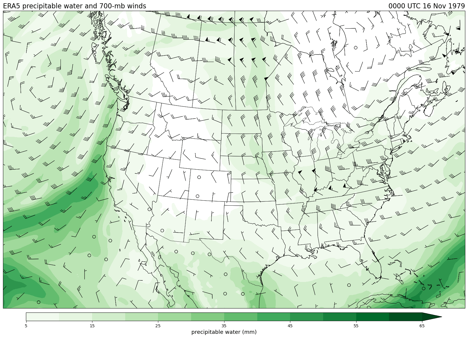 Data obtained from the ECWMF Climate Data Store and plotted using tools from the Unidata Python training gallery.