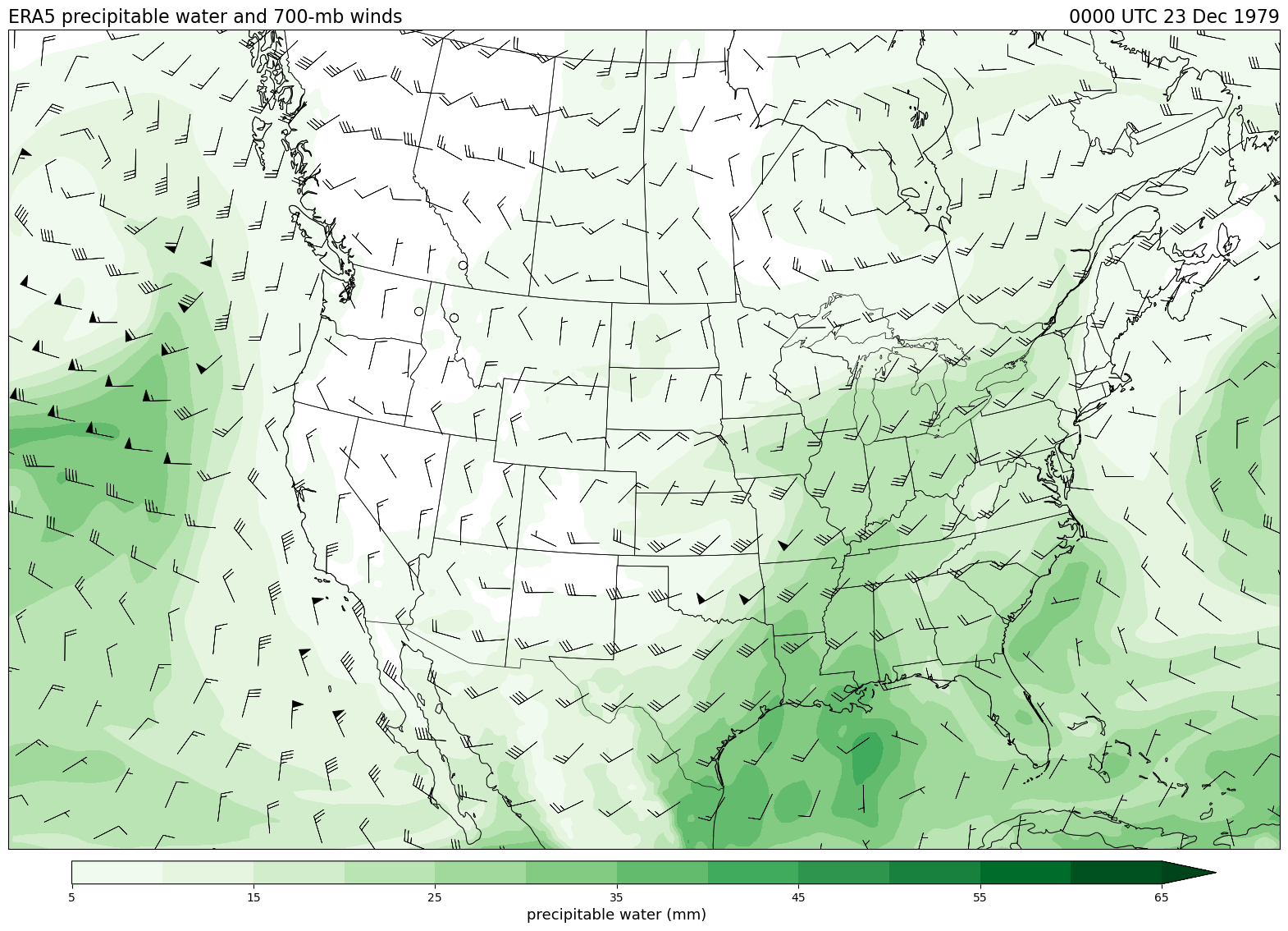 Data obtained from the ECWMF Climate Data Store and plotted using tools from the Unidata Python training gallery.