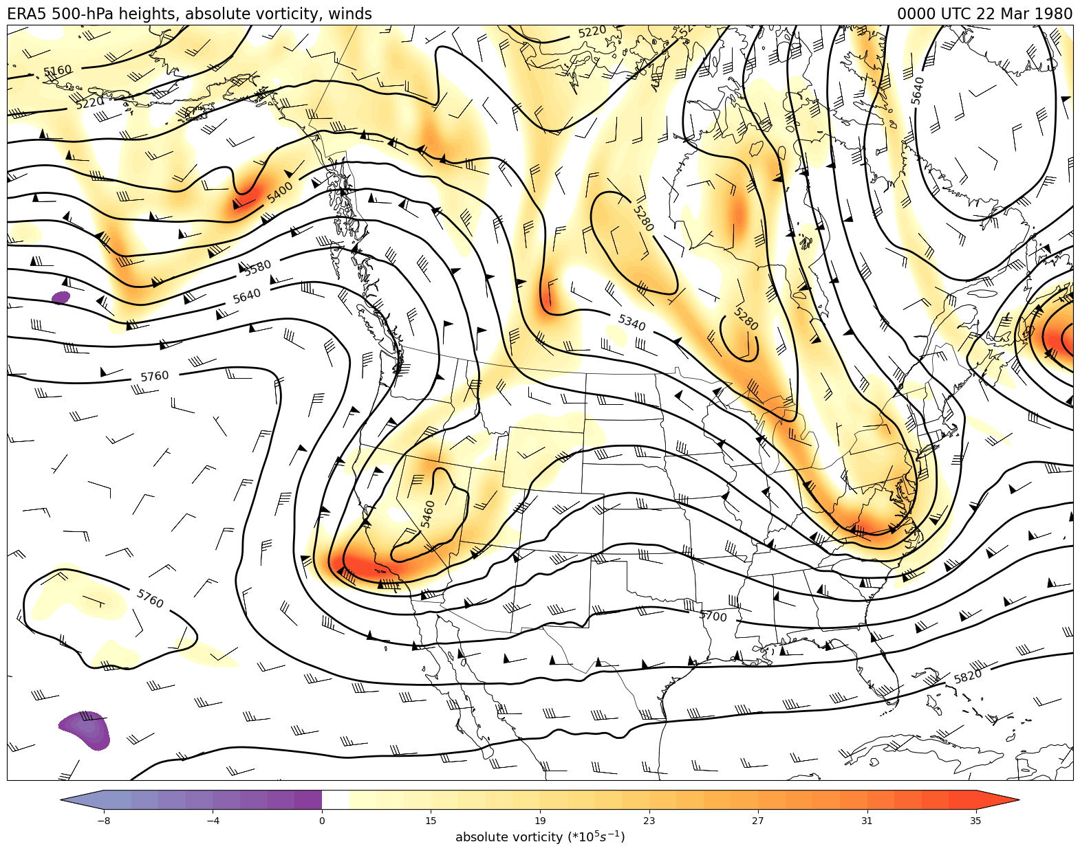 Data obtained from the ECWMF Climate Data Store and plotted using tools from the Unidata Python training gallery.