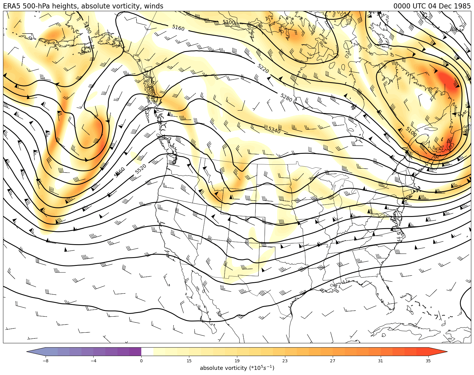 Data obtained from the ECWMF Climate Data Store and plotted using tools from the Unidata Python training gallery.