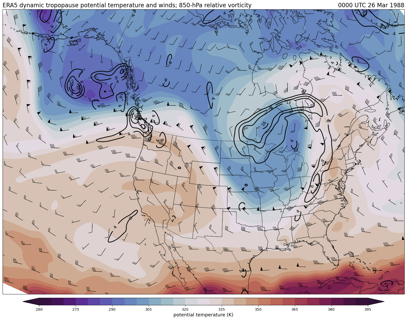 Data obtained from the ECWMF Climate Data Store and plotted using tools from the Unidata Python training gallery.