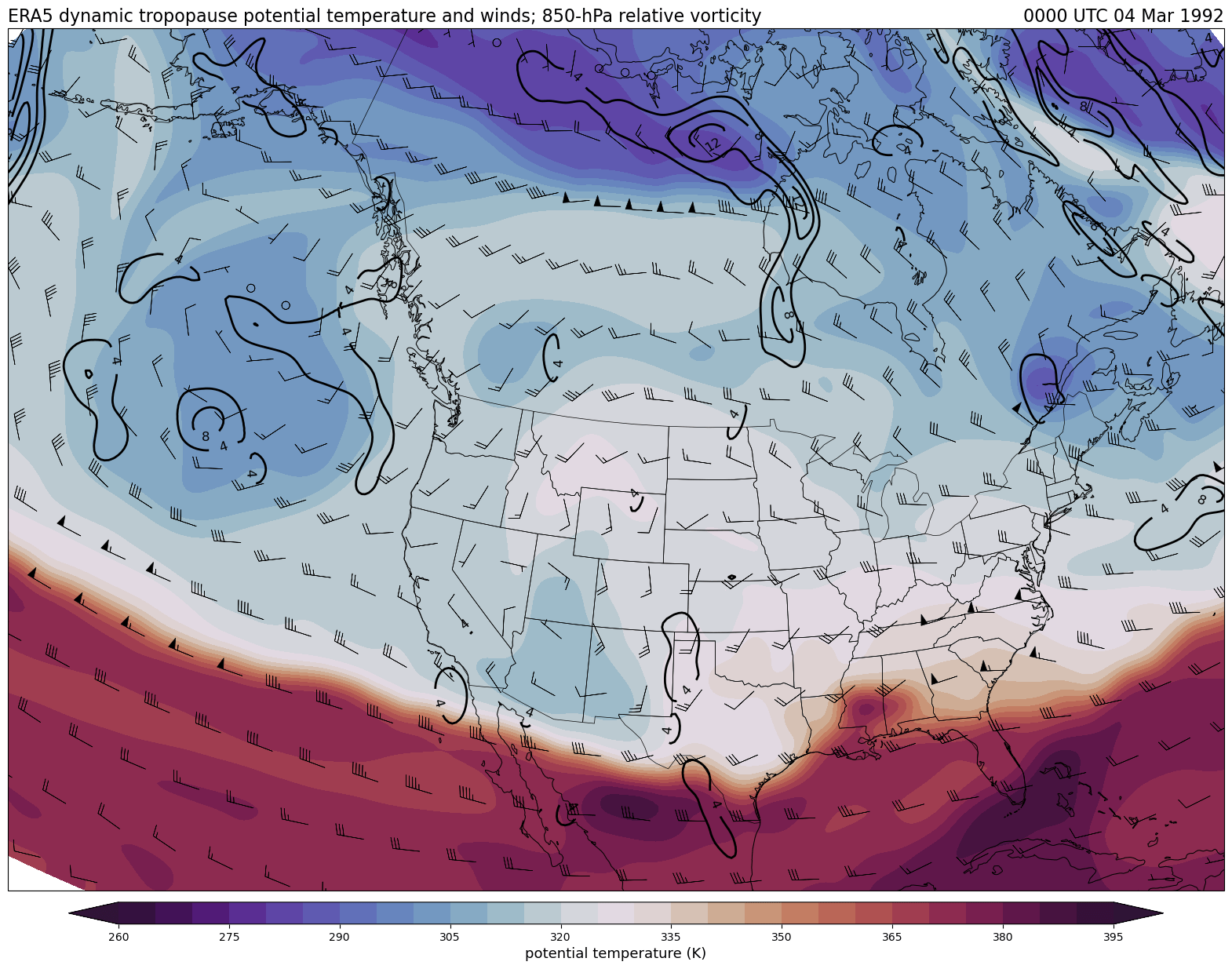 Data obtained from the ECWMF Climate Data Store and plotted using tools from the Unidata Python training gallery.