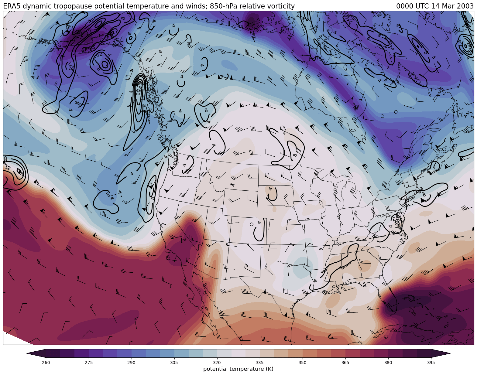 Data obtained from the ECWMF Climate Data Store and plotted using tools from the Unidata Python training gallery.