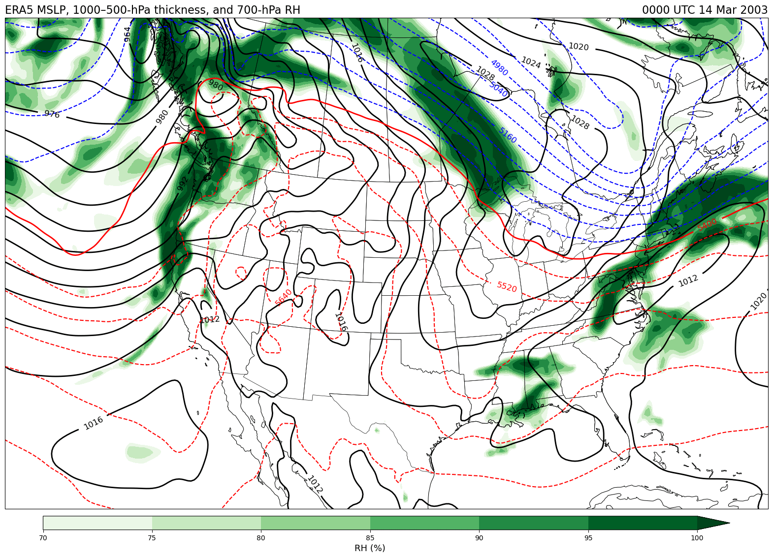 Data obtained from the ECWMF Climate Data Store and plotted using tools from the Unidata Python training gallery.