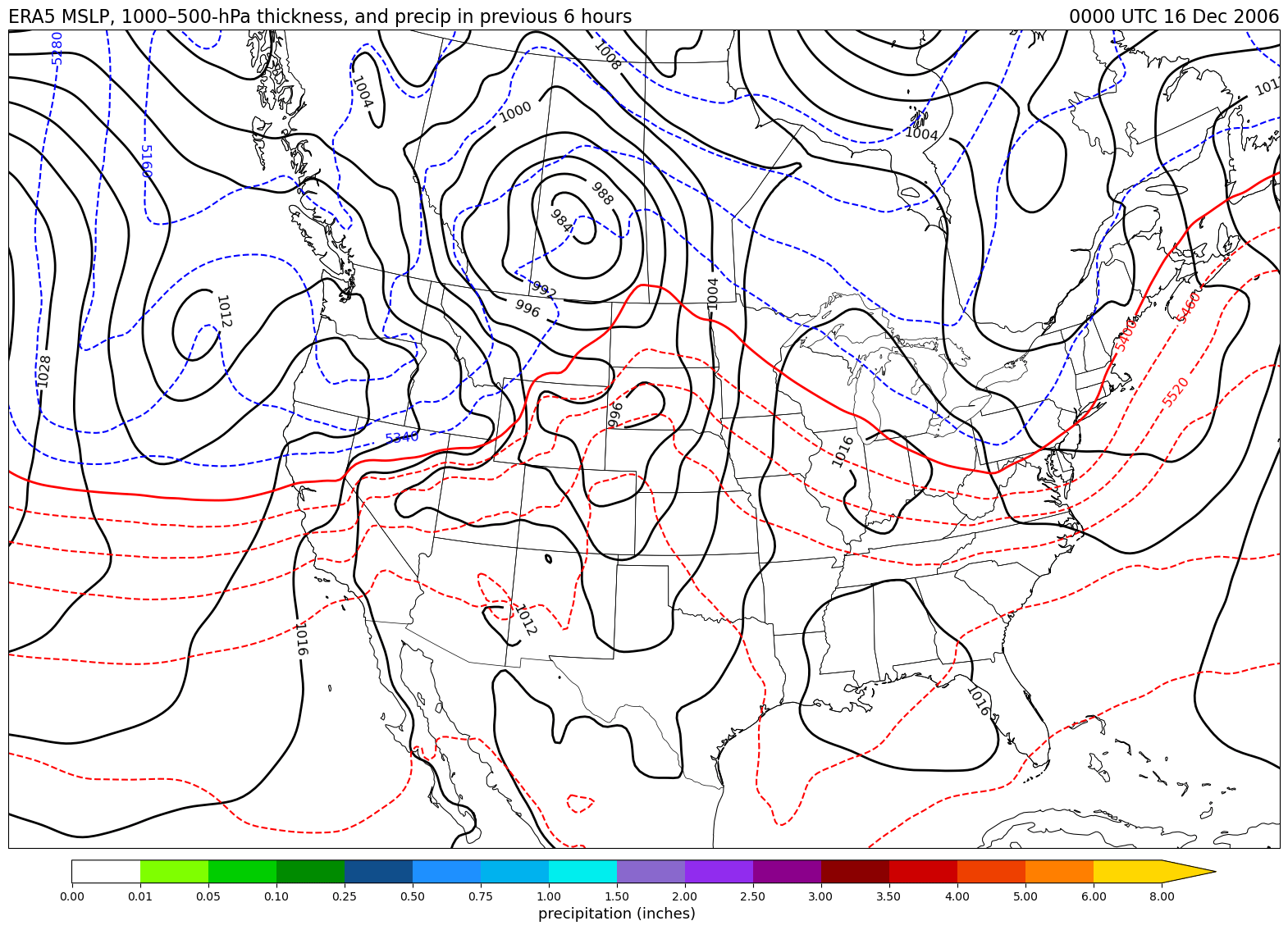 Data obtained from the ECWMF Climate Data Store and plotted using tools from the Unidata Python training gallery.