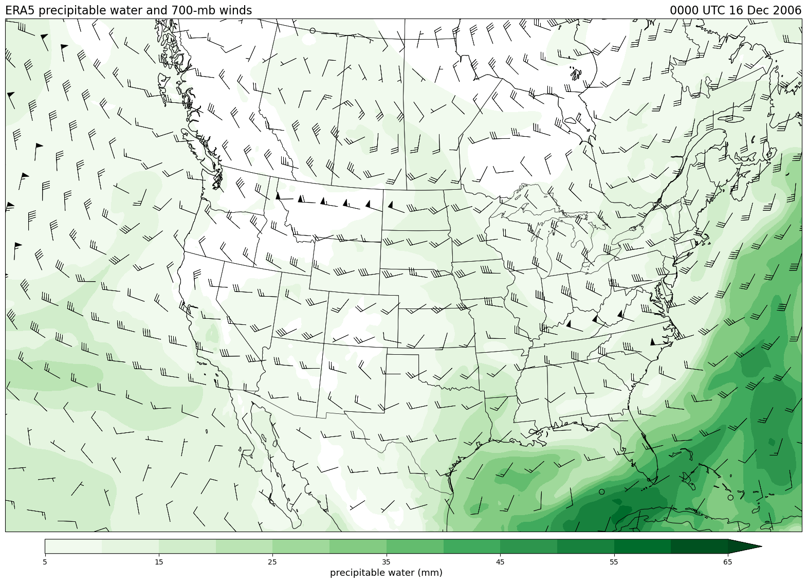 Data obtained from the ECWMF Climate Data Store and plotted using tools from the Unidata Python training gallery.