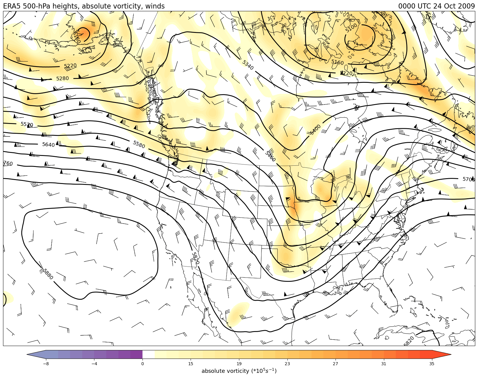 Data obtained from the ECWMF Climate Data Store and plotted using tools from the Unidata Python training gallery.