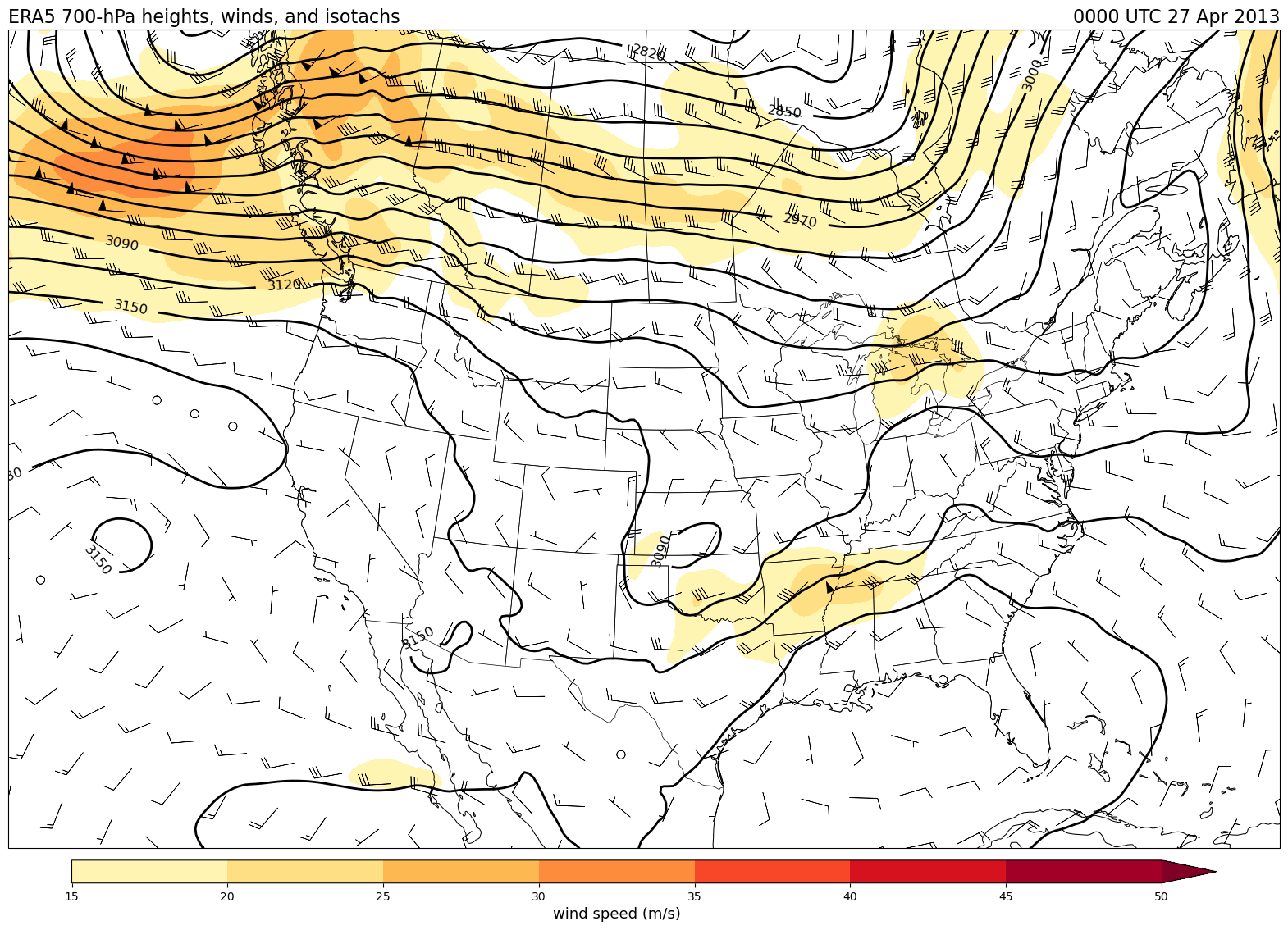 Data obtained from the ECWMF Climate Data Store and plotted using tools from the Unidata Python training gallery.