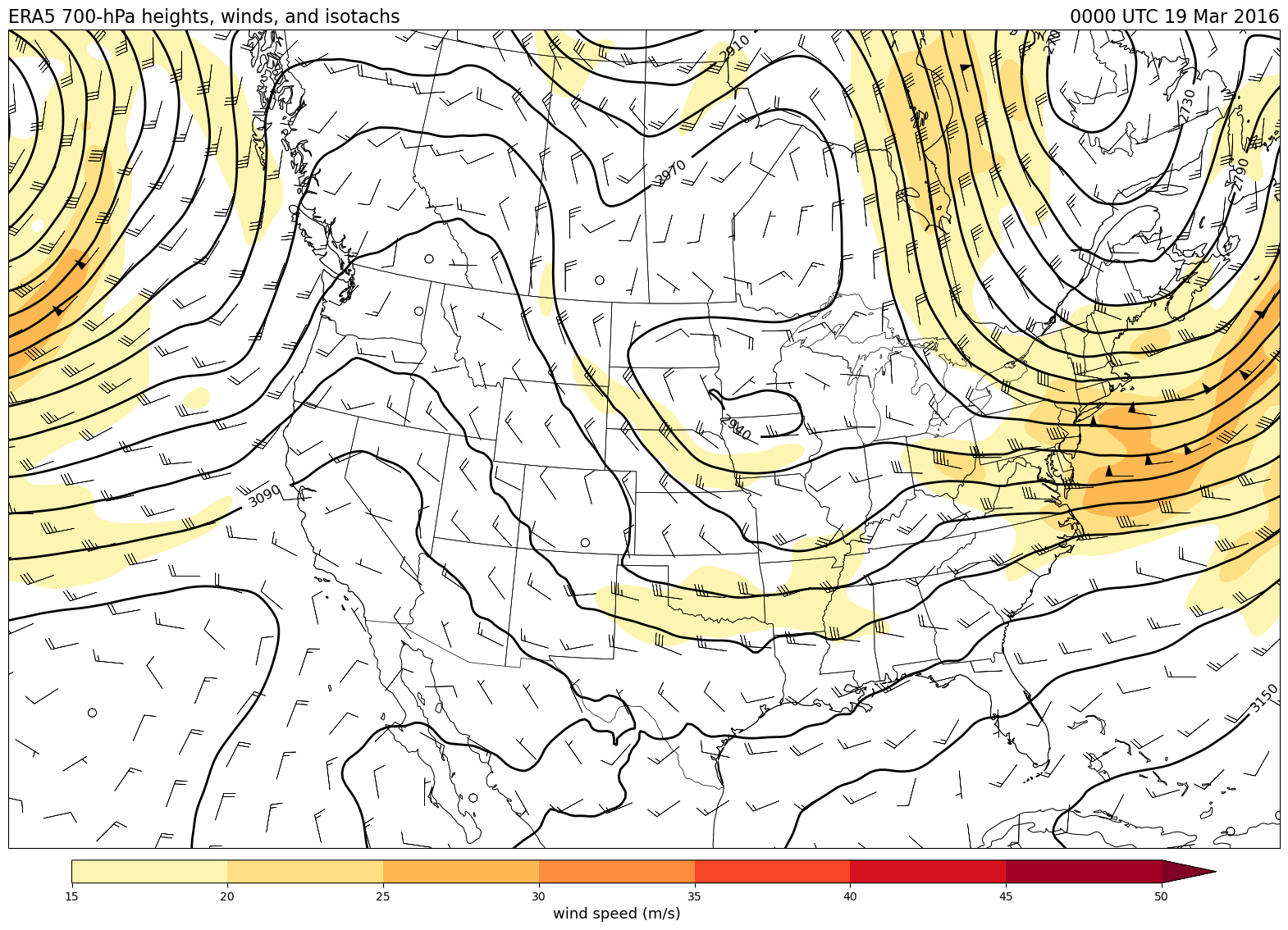 Data obtained from the ECWMF Climate Data Store and plotted using tools from the Unidata Python training gallery.