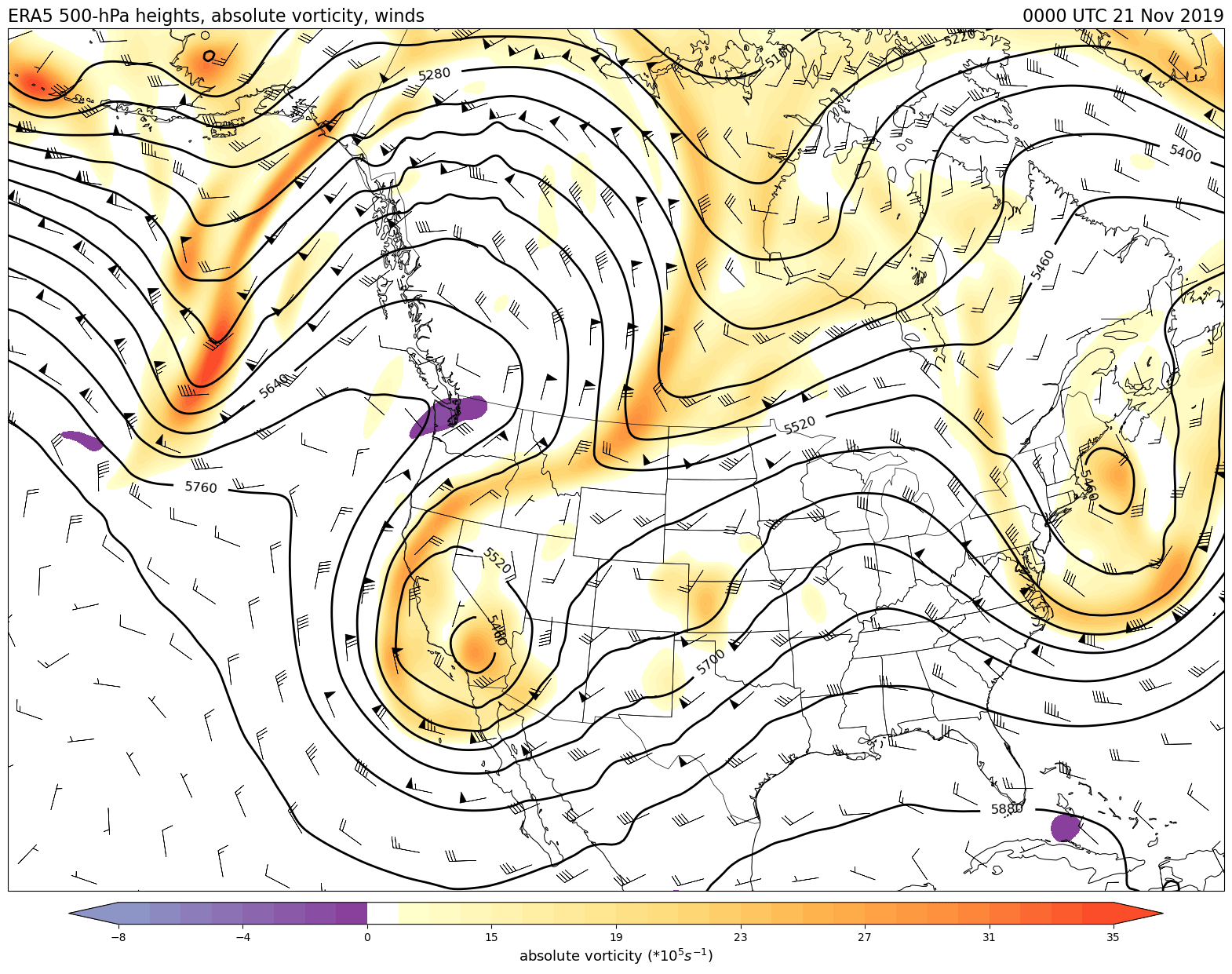 Data obtained from the ECWMF Climate Data Store and plotted using tools from the Unidata Python training gallery.