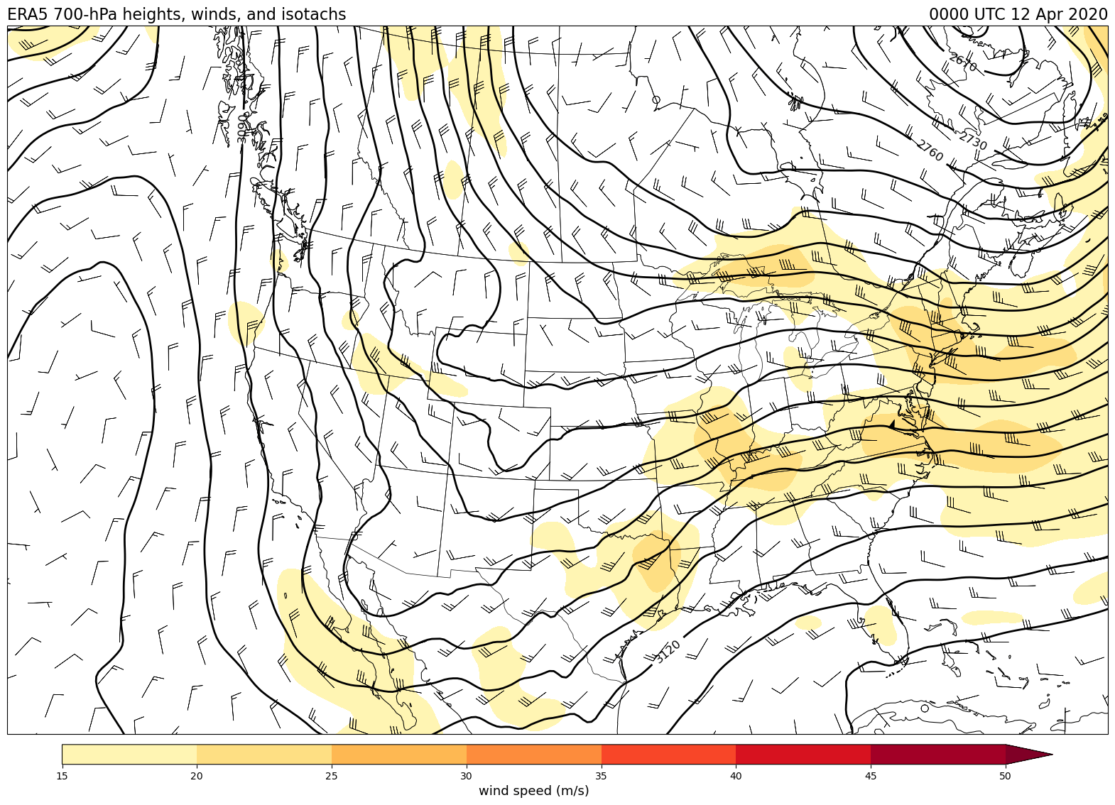 Data obtained from the ECWMF Climate Data Store and plotted using tools from the Unidata Python training gallery.
