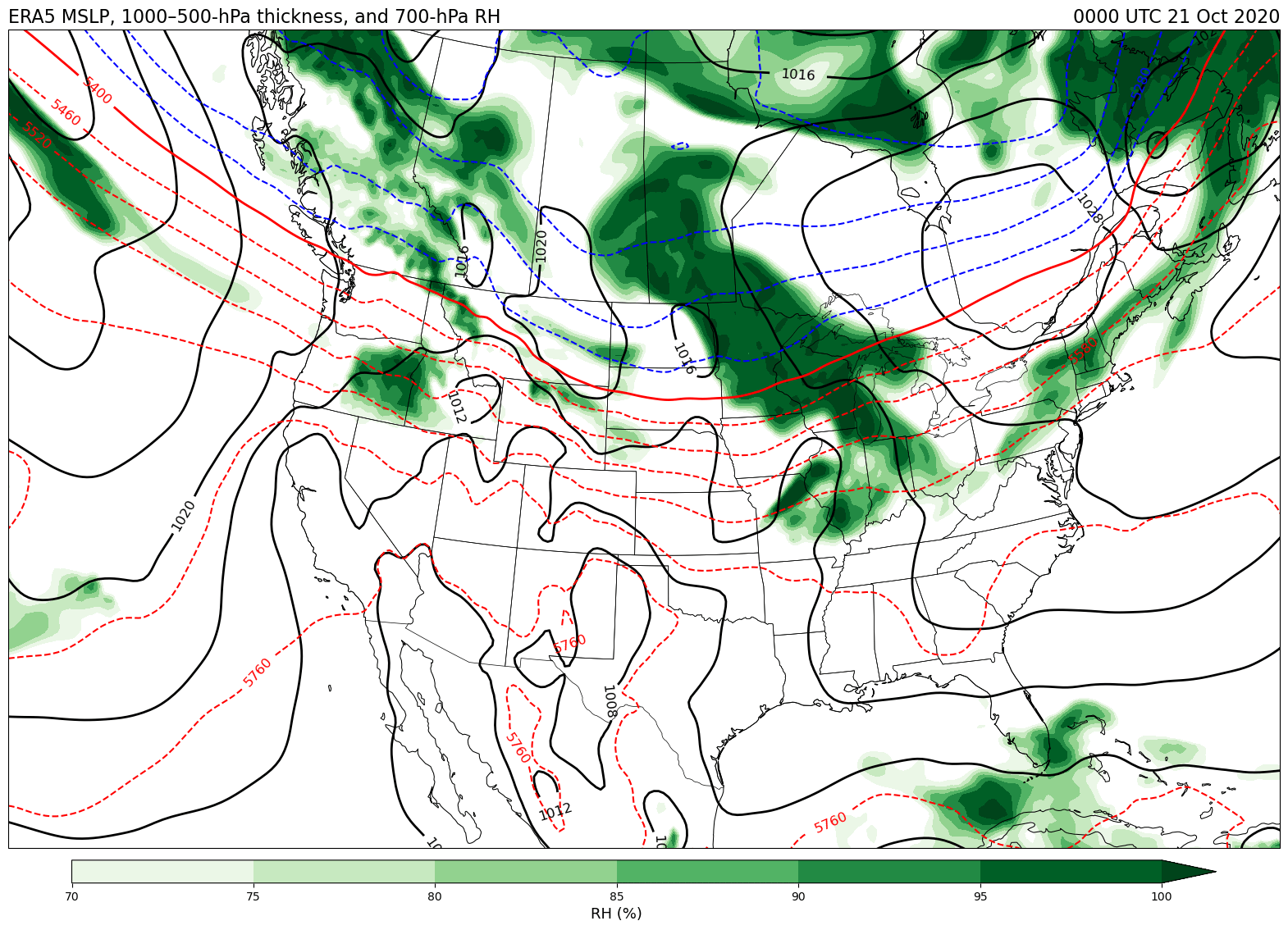 Data obtained from the ECWMF Climate Data Store and plotted using tools from the Unidata Python training gallery.