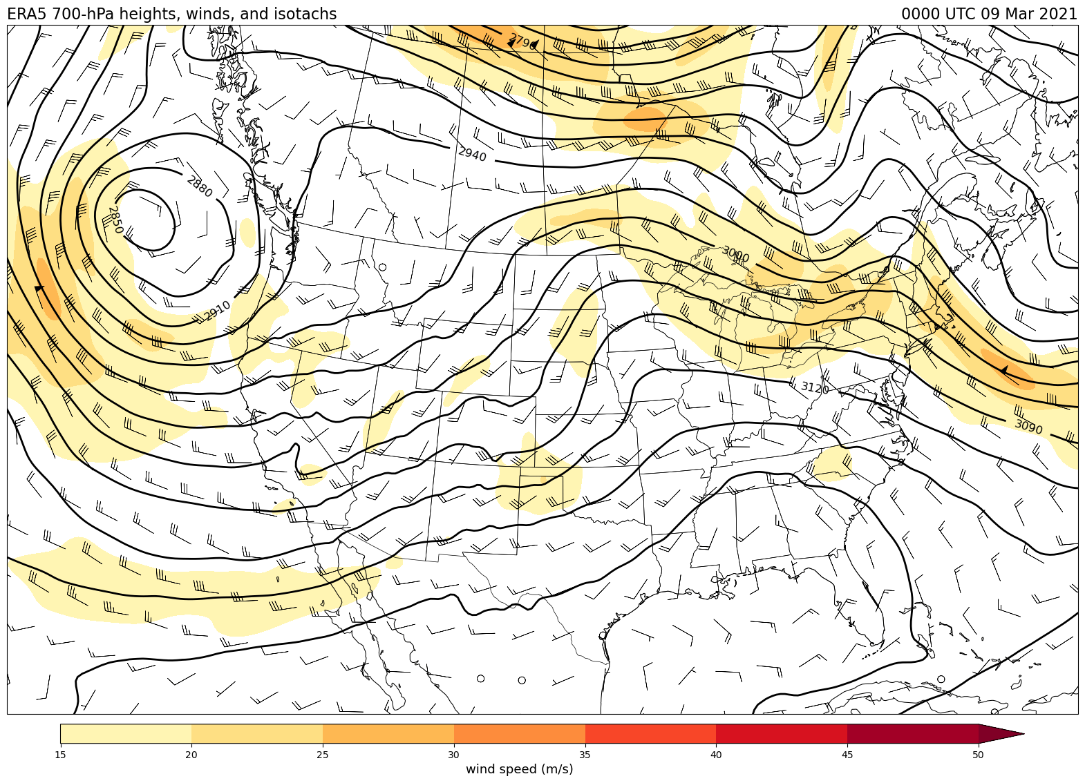 Data obtained from the ECWMF Climate Data Store and plotted using tools from the Unidata Python training gallery.