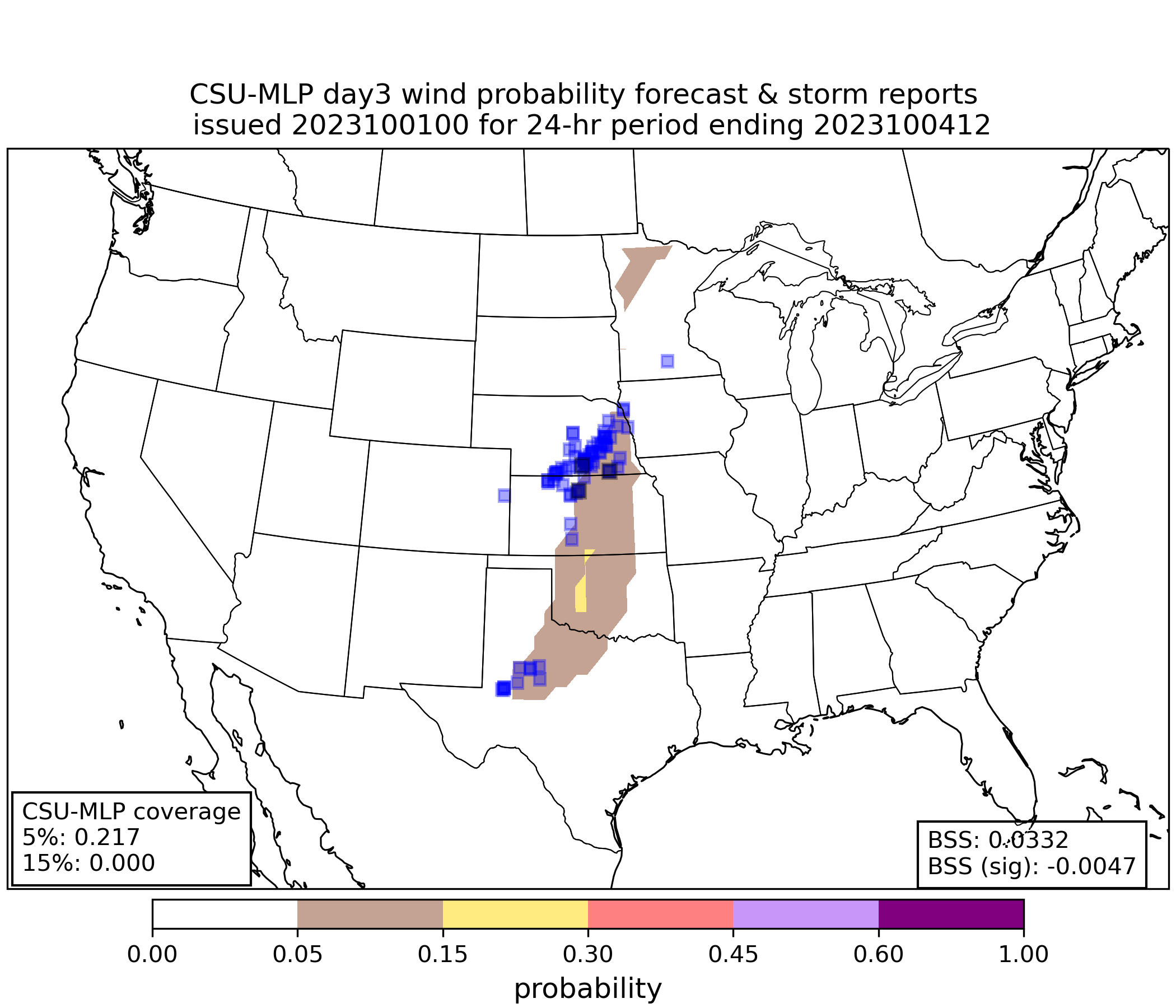 Verification of probabilistic machine learning forecasts (left) alongside operational Storm Prediction Center outlooks (right). Red, green, and blue dots on plots represent reports of tornadoes, hail, and wind, respectively.