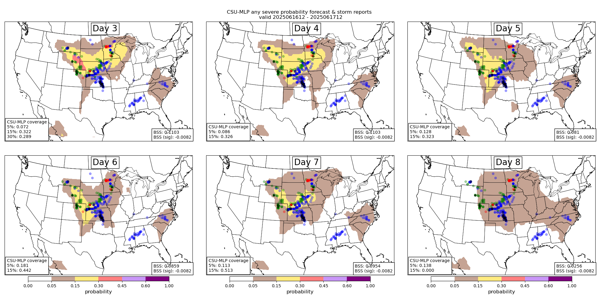 Verification of probabilistic machine learning forecasts (left) alongside operational Storm Prediction Center outlooks (right). Red, green, and blue dots on plots represent reports of tornadoes, hail, and wind, respectively.