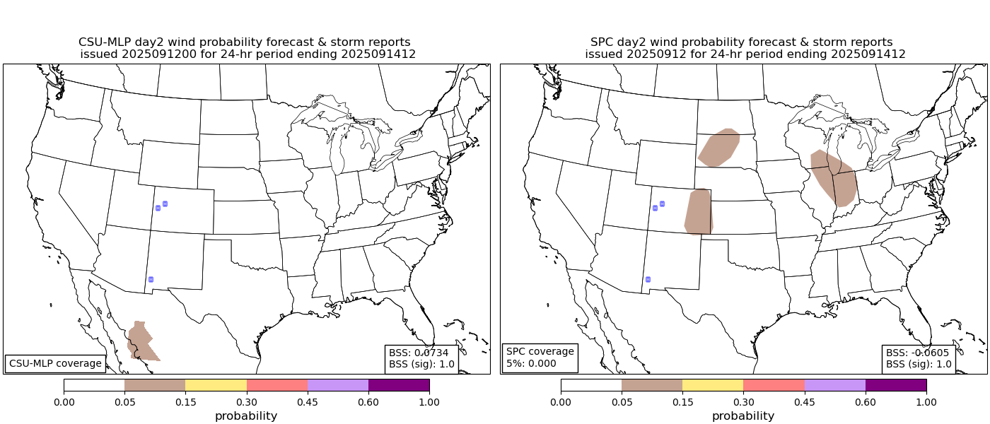 Verification of probabilistic machine learning forecasts (left) alongside operational Storm Prediction Center outlooks (right). Red, green, and blue dots on plots represent reports of tornadoes, hail, and wind, respectively.